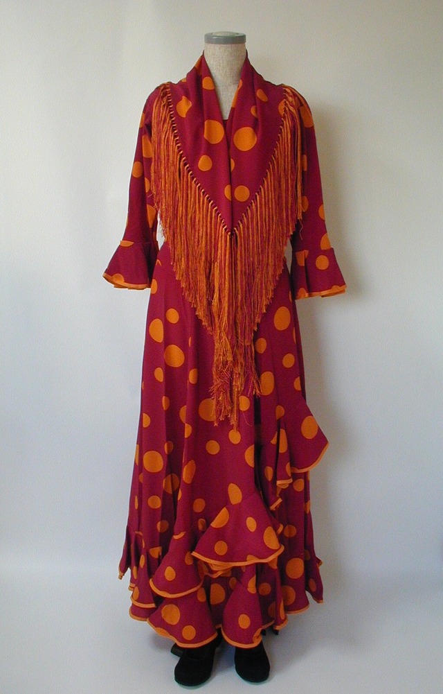 ワインレッドと辛子色を基調とした花柄と水玉のコンビ柄の華やかな衣裳です。 ウエスト 63㎝ 丈 85㎝ シージョとのセット価格は9,000円 共布のボウタイとのセット価格は8,000円 帽子、フラメンコシューズなどは着用イメージです。 こちらの商品はスカートのみのレンタルとなります。 素材:コチーボ(ポリエステル)