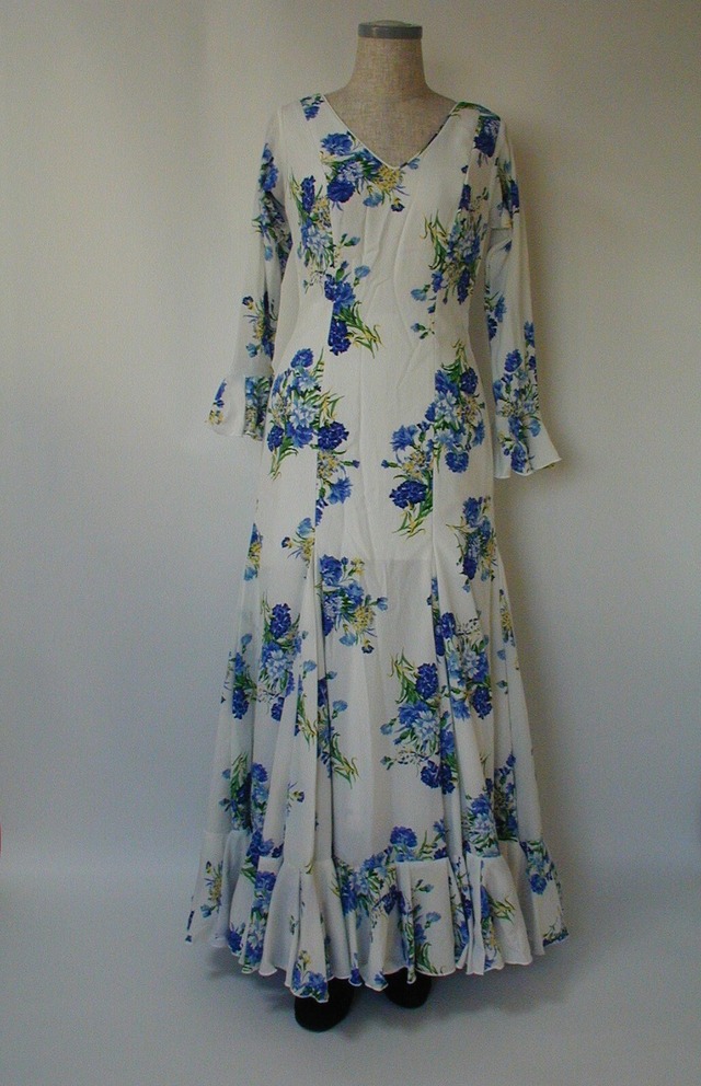 白地に青色系花柄のワンピース ペチコートはハシゴレースに青色のリボンが通っており、青色の1段フリルがついています。 こちらの商品は、ワンピース、共布のシージョとペチコートの3点セットです。 同デザインで38号と40号各1着あります KBN-0300 40号 B90 W68 ペチコートW63 丈95 KBN-0400 38号 B88 W63 ペチコートW63 丈93 素材:コチーボ(ポリエステル)
