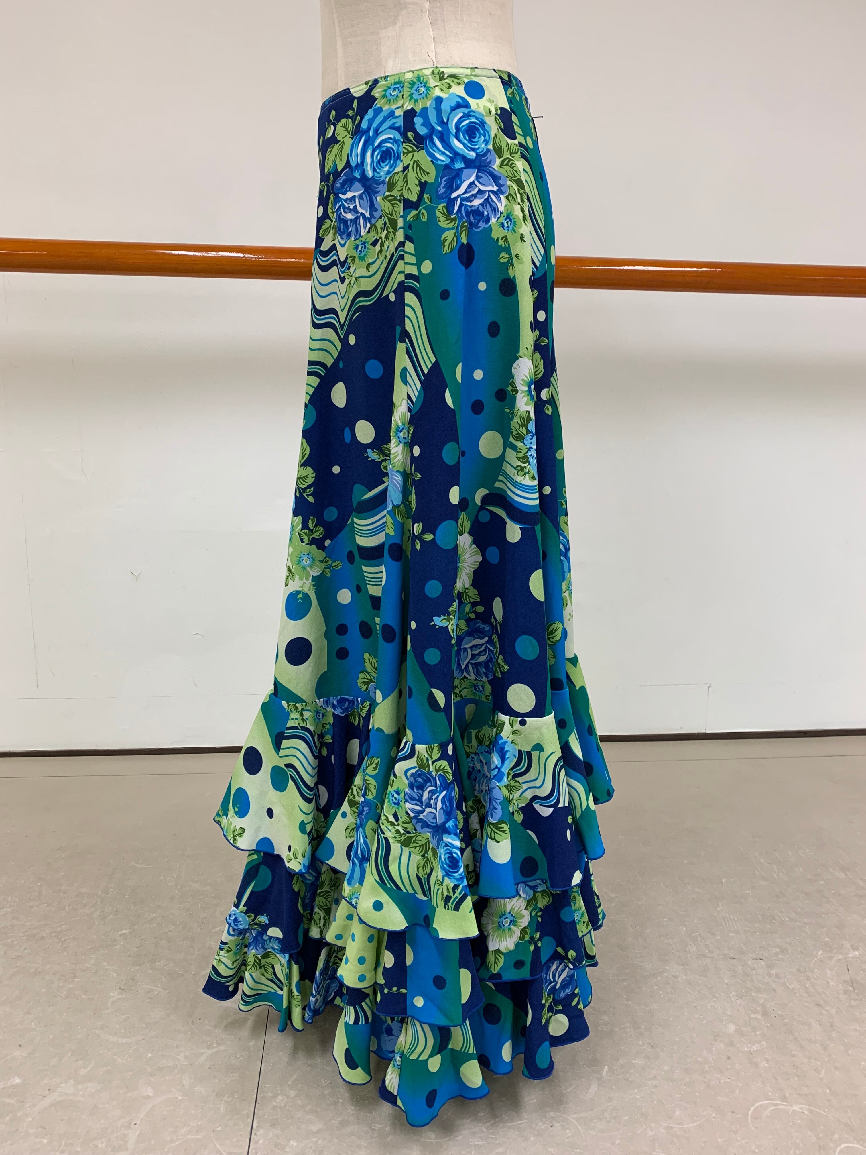 GRA-0520 ブルー系花柄×水玉コンビ 3段フリルスカート
