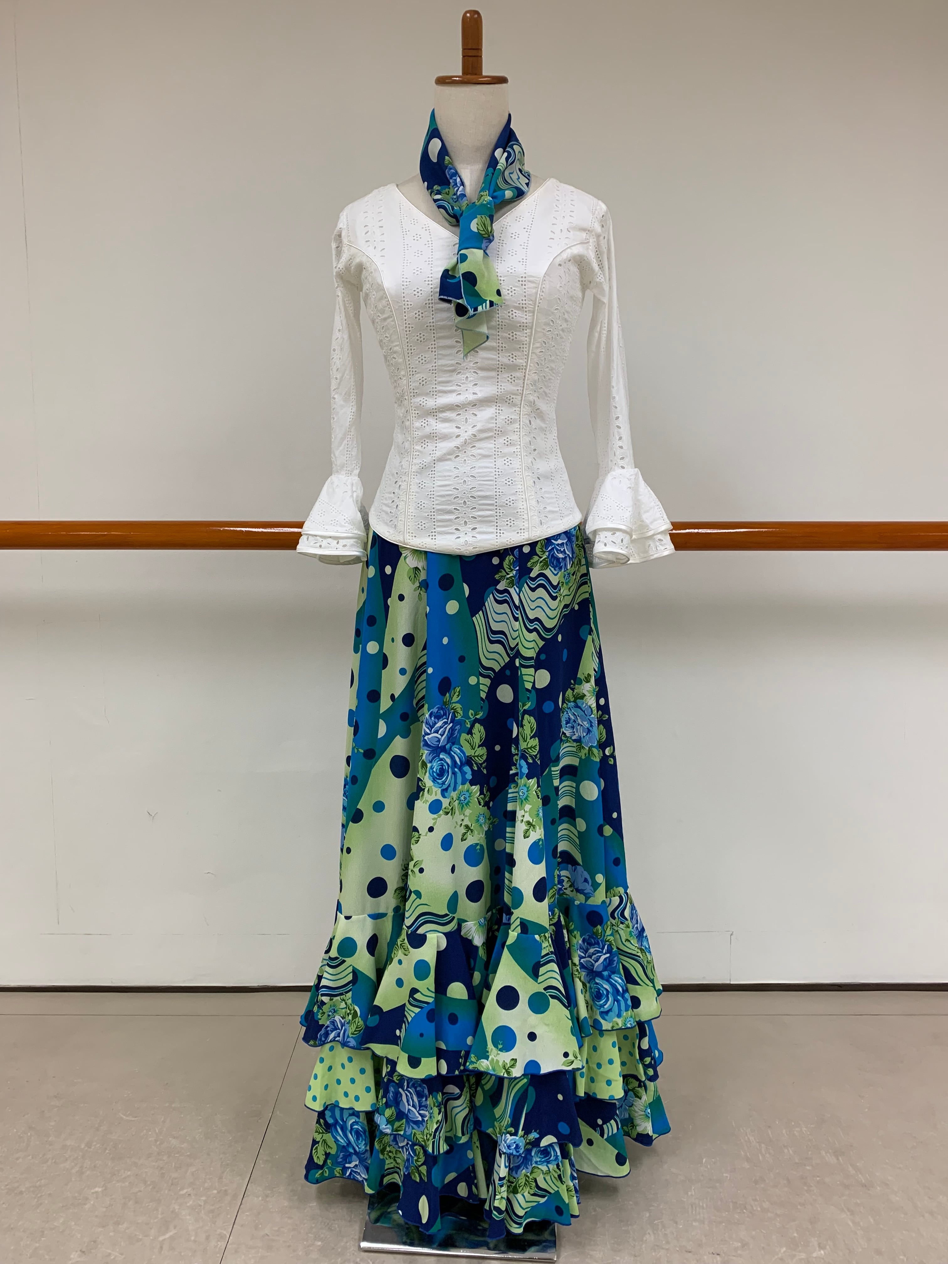 ブルーと若草色を基調とした花柄と水玉のコンビ柄の華やかな衣裳です。