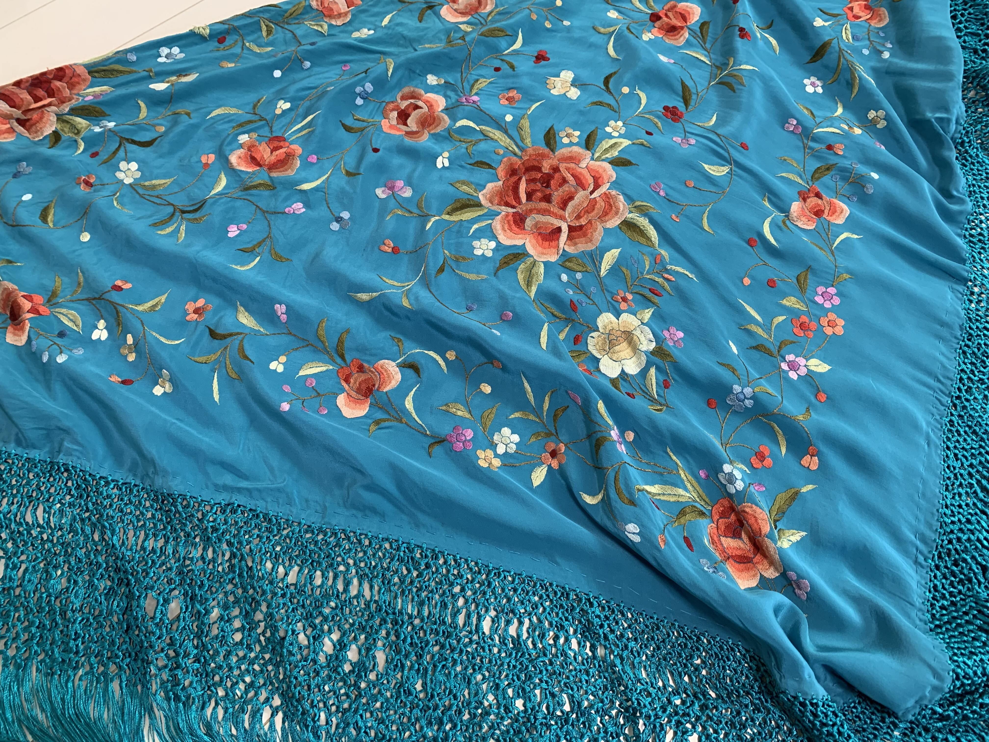 MT135-01 マントン ブルーグリーン地赤系刺繍
