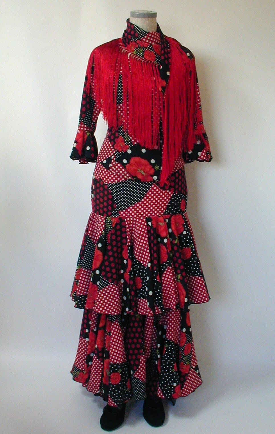赤地に水玉、黒地に花柄のパターン柄のセットアップ衣裳です