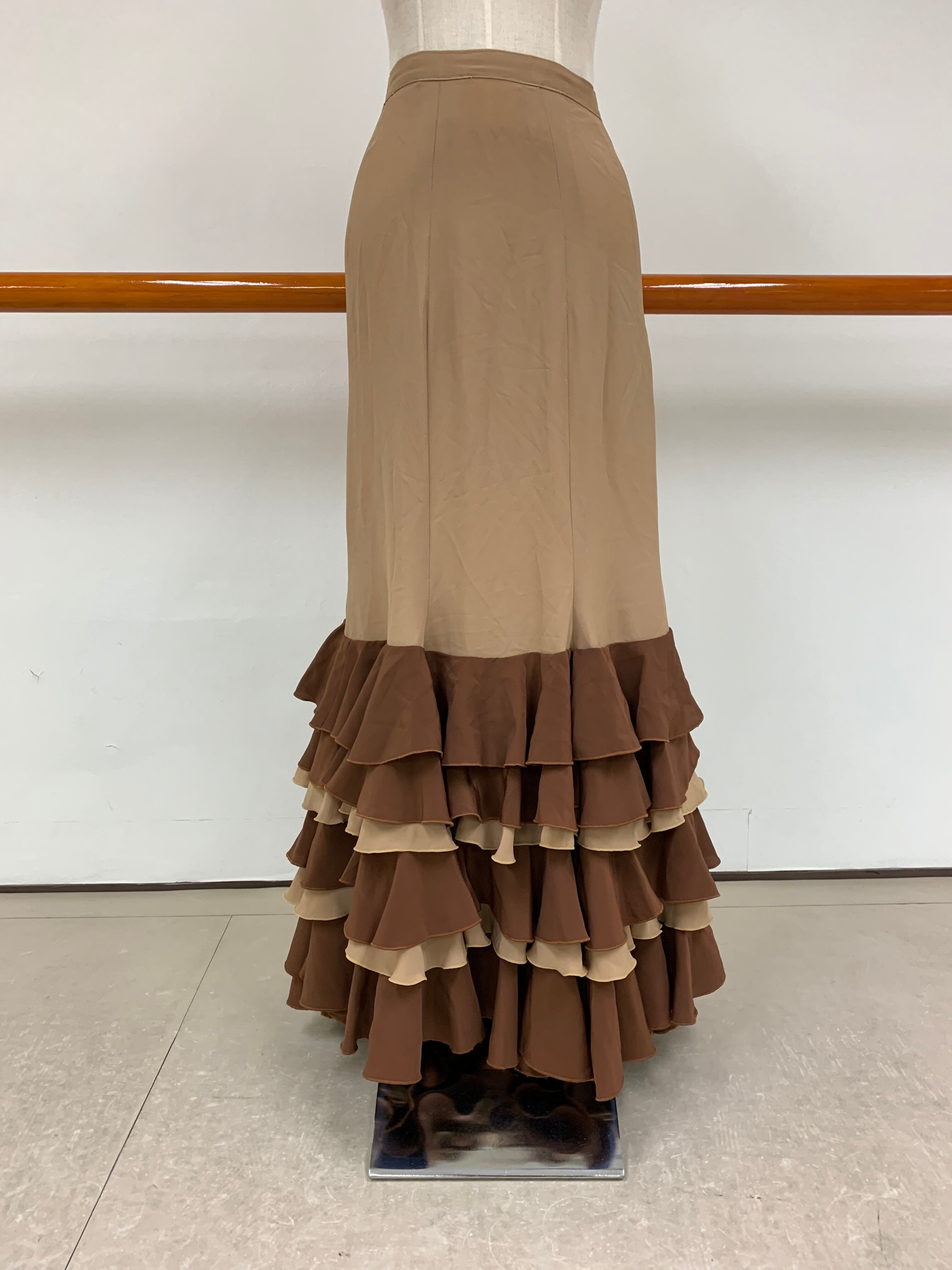 茶色地に小花柄の巻きスカート。ティアードの2段フリル。