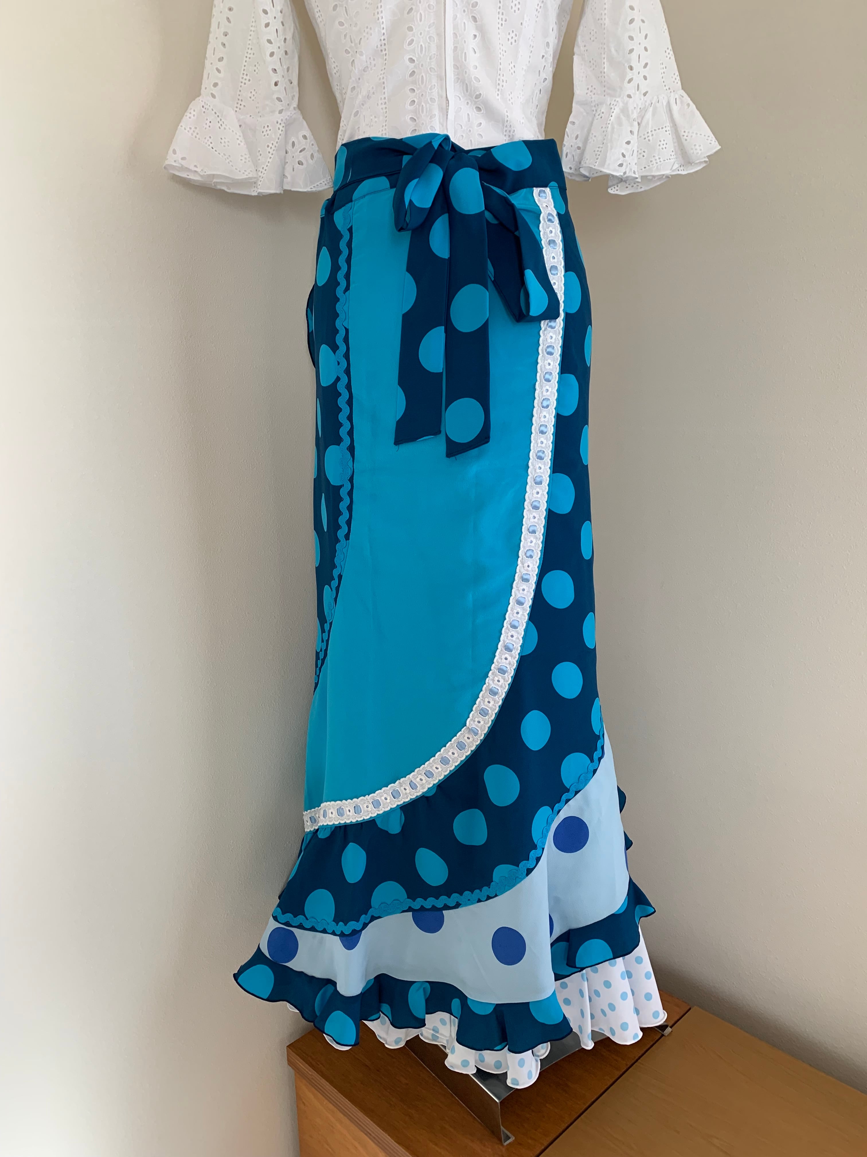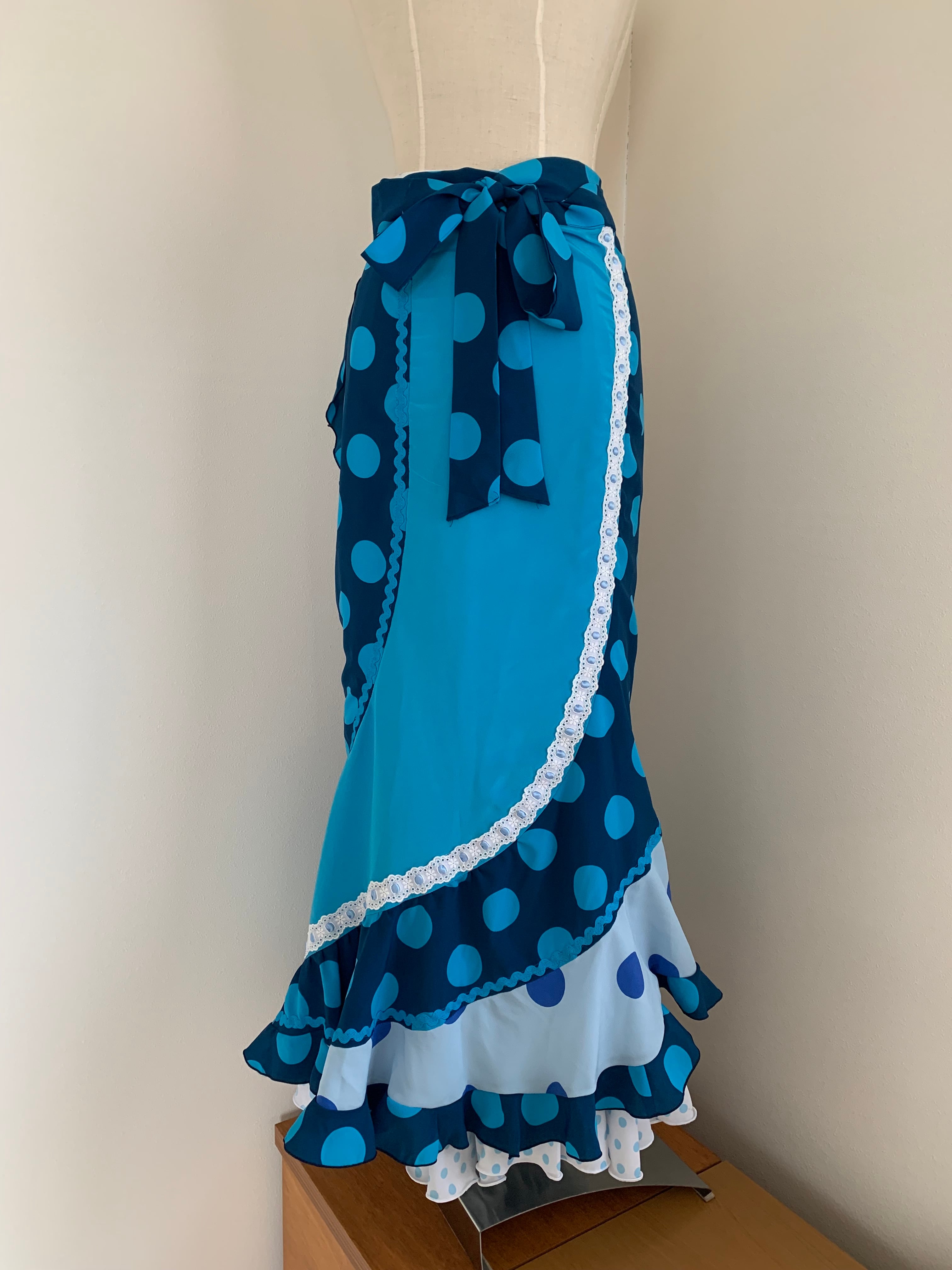 水色地に青水玉/青地にトルコブルー水玉/トルコブルー無地のカラコル巻きスカートです